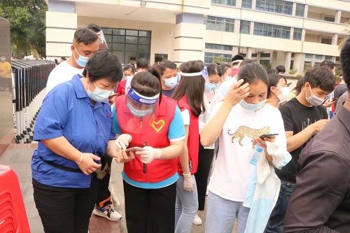 從早上8點(diǎn)半起,周邊企業(yè)的員工們就分批來(lái)到等待區(qū)域。“請(qǐng)往這里走。”“麻煩出示一下行程碼。”一抹抹白色與紅色交織的身影,正在進(jìn)行現(xiàn)場(chǎng)分流引導(dǎo)、幫忙查詢行程,他們正是由邁銳光電黨支部黨員和入黨積極分子組成的7人志愿者隊(duì)伍。在他們的助力下,現(xiàn)場(chǎng)每個(gè)步驟環(huán)環(huán)相扣、有條不紊,在當(dāng)日16時(shí)即完成全部6500余人的核酸檢測(cè)工作,讓黨旗在防疫一線高高飄揚(yáng)。