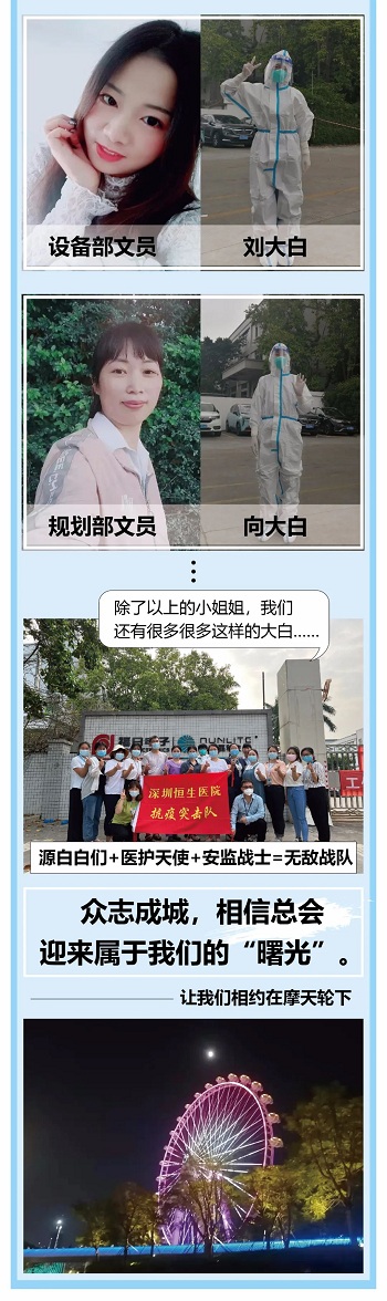 無(wú)獨(dú)有偶,源磊科技也用“微光聚愛(ài)”。從2月26日至3月22日,在其中的13個(gè)日子里,源磊科技的16名志愿者“逆行”奔赴防疫前線,配合當(dāng)?shù)赜嘘P(guān)部門(mén)開(kāi)展消毒、核酸檢測(cè)等工作。無(wú)論驕陽(yáng)似火,亦或刮風(fēng)下雨,這群“大白”們都堅(jiān)守在志愿服務(wù)一線。正如他們所說(shuō),疫情當(dāng)前,他們從不缺席,迎接美好四月天是他們堅(jiān)持的動(dòng)力。