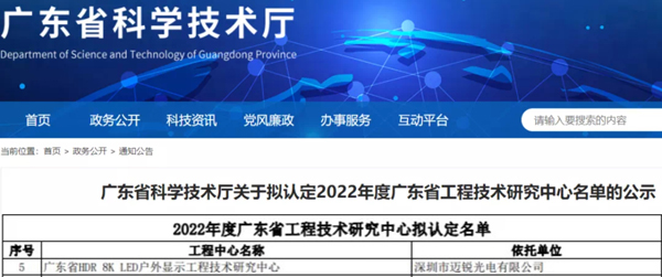 近日,廣東省科學(xué)技術(shù)廳發(fā)布了《關(guān)于擬認(rèn)定2022年度廣東省工程技術(shù)研究中心名單的公示》,經(jīng)專家評(píng)審和網(wǎng)上公示,福日電子成員企業(yè)邁銳光電獲2022年度廣東省HDR 8K LED戶外顯示工程技術(shù)研究中心資格認(rèn)定。