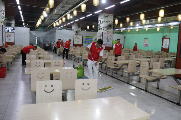 首先進(jìn)行的是公司食堂的清掃清潔。只見志愿者們有的手持抹布,有的揮舞拖把,有的幫忙換水,大家團(tuán)結(jié)協(xié)作分工有序埋頭苦干,對食堂的打菜窗口、桌椅板凳、地面墻角等處進(jìn)行深入清掃,做到不留衛(wèi)生死角。通過辛勤勞動,食堂的環(huán)境衛(wèi)生狀況得到改善,面貌煥然一新。